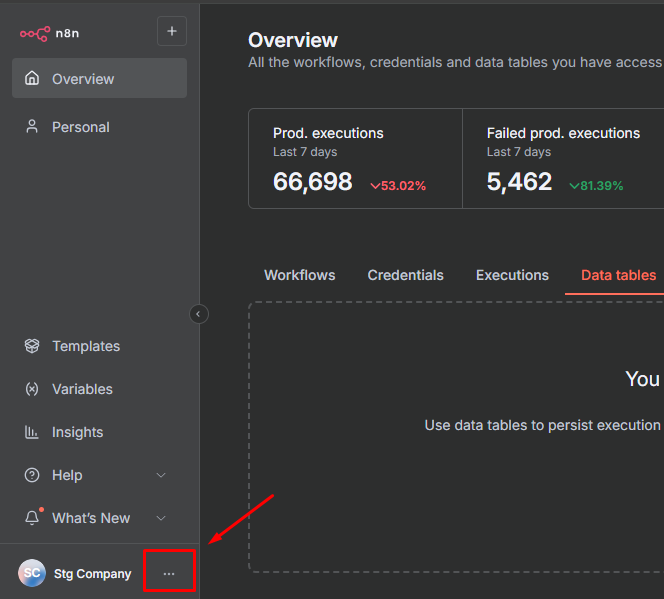 In N8N, click on the three dots in the upper right corner of the interface.