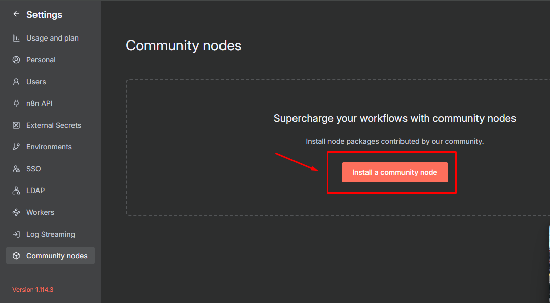 Click the Install a community node button to add a new package.